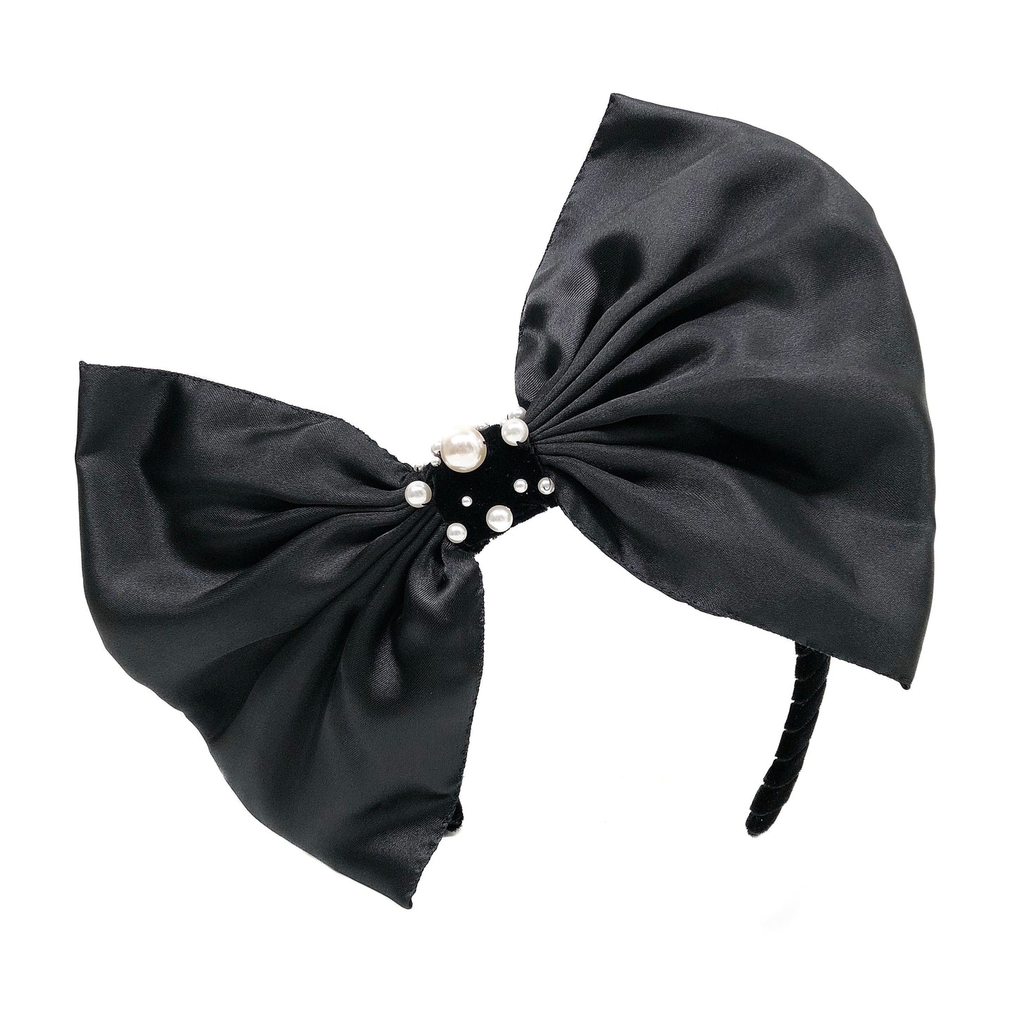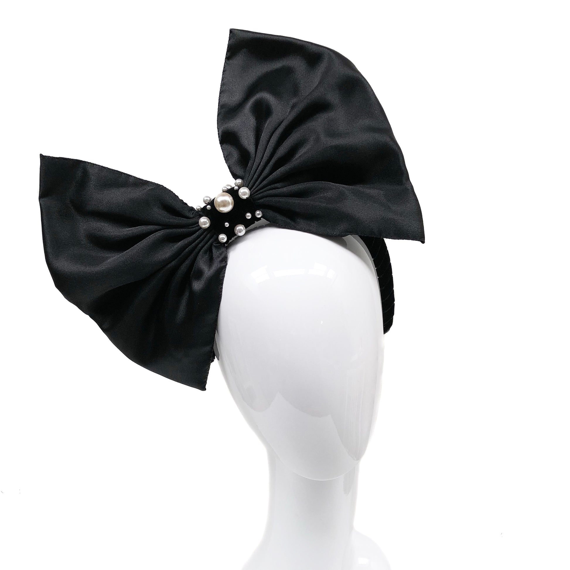 • Meticulously handcrafted using black satin, plush velvet and swarovski pearls. Featuring a large playful bow. Finished perfectly on a moon shaped comfortable seamless crown headband featuring luxe black velvet ribbon.