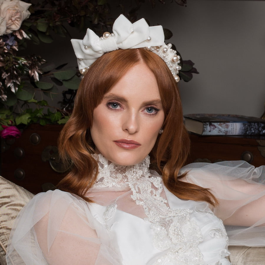 • Meticulously handcrafted from an array of luxurious components including ivory velvet featuring luxurious bows and hand stitched embroidered floral lace with Swarovski pearls. Finished perfectly on a moon shaped comfortable seamless crown headband featuring luxe ivory velvet ribbon.